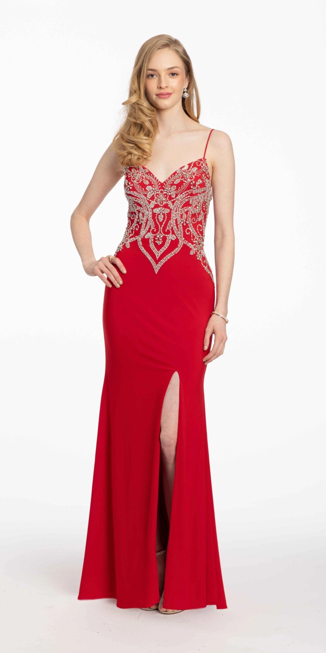 This sophisticated evening dress is just waiting for an invite to your next event! With its sweetheart neckline, rhinestone detailing on the bodice, and thigh high leg slit, this long prom dress is truly a stunner. Also wear it as a wedding guest dress. Complement the look with gold accessories to finish.