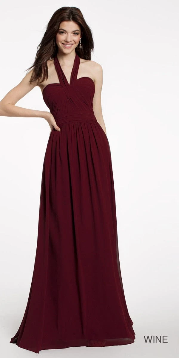 This unique look makes for a flawless bridesmaid dress! With its tie neckline, fitted bodice, A-line chiffon skirt, and center back zipper, this evening gown is wedding party-ready. Pair with nude heels, a rhinestone ring, and a gold clutch.