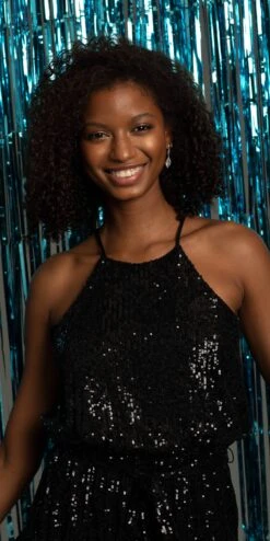 Shimmer and shake all night long in this darling dress! This dress features a halter neckline, blouson bodice with waist tie, tiered skirt, and center back zipper. This is the perfect dress for homecoming, cocktail party, holiday party, or black tie wedding.
