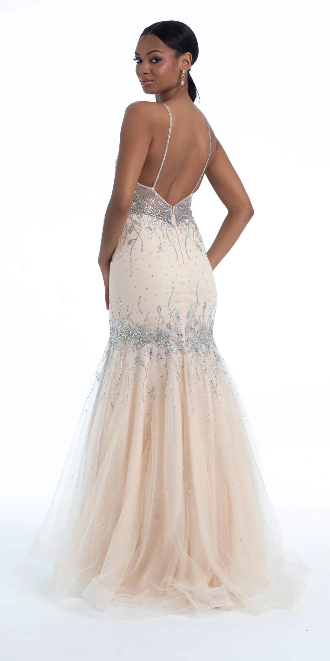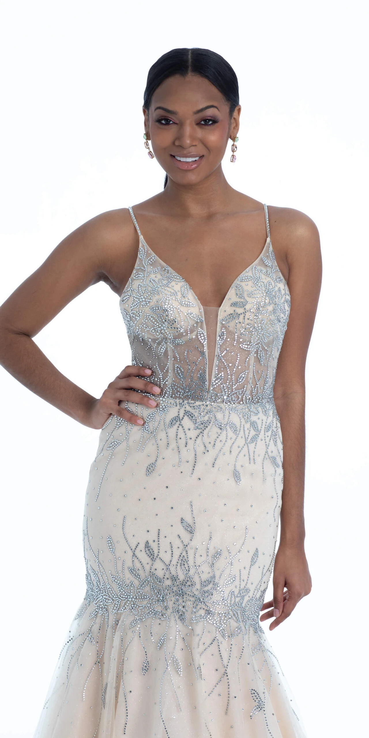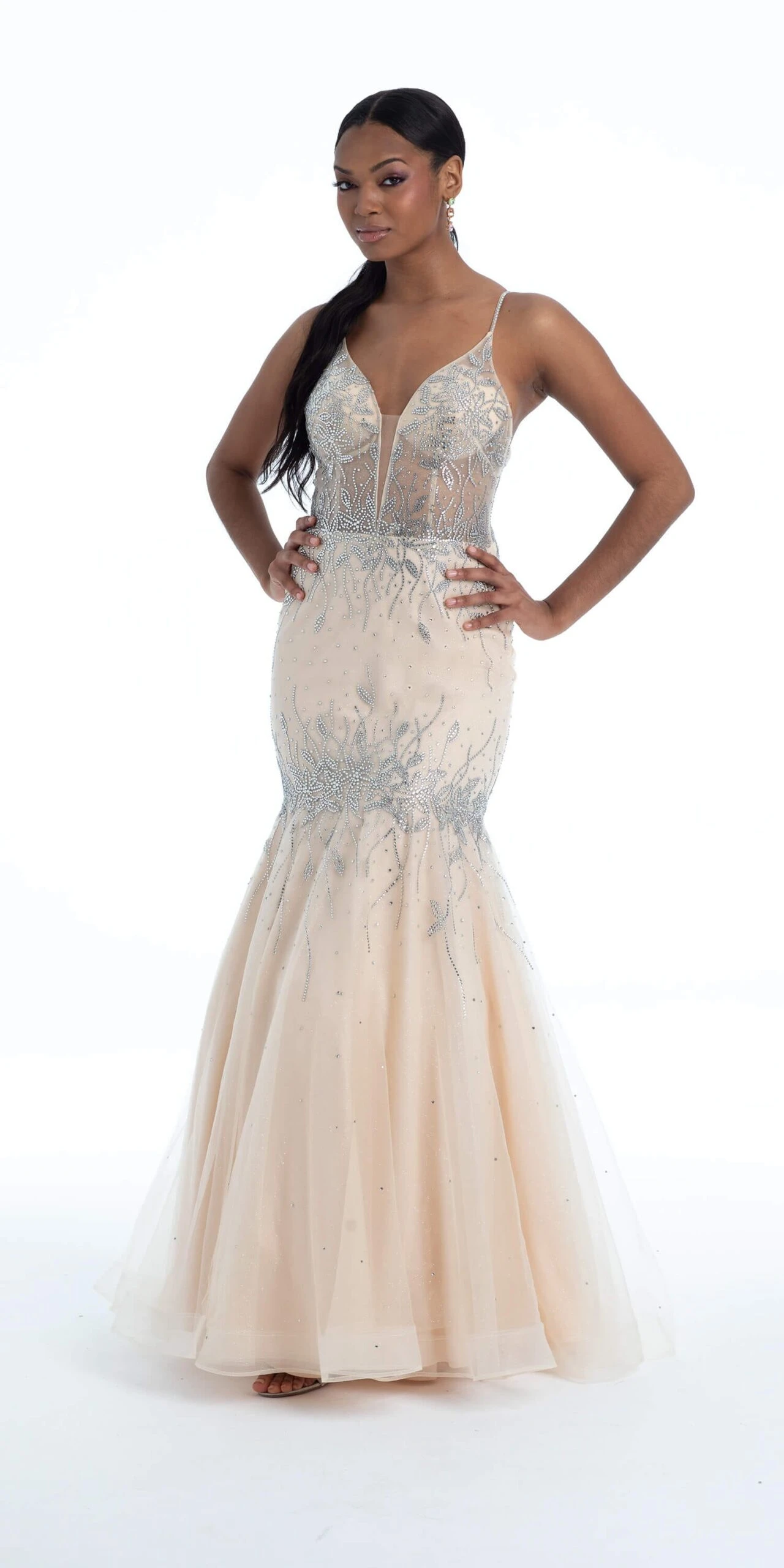 Champagne kisses and movie star wishes! Strut the red carpet in this dress with its plunging neckline, fitted beaded illusion bodice, mermaid silhouette with godets, and v open back. Slip into this style for prom, an evening event, or gala! Pair this with silver accessories for some extra sparkle!