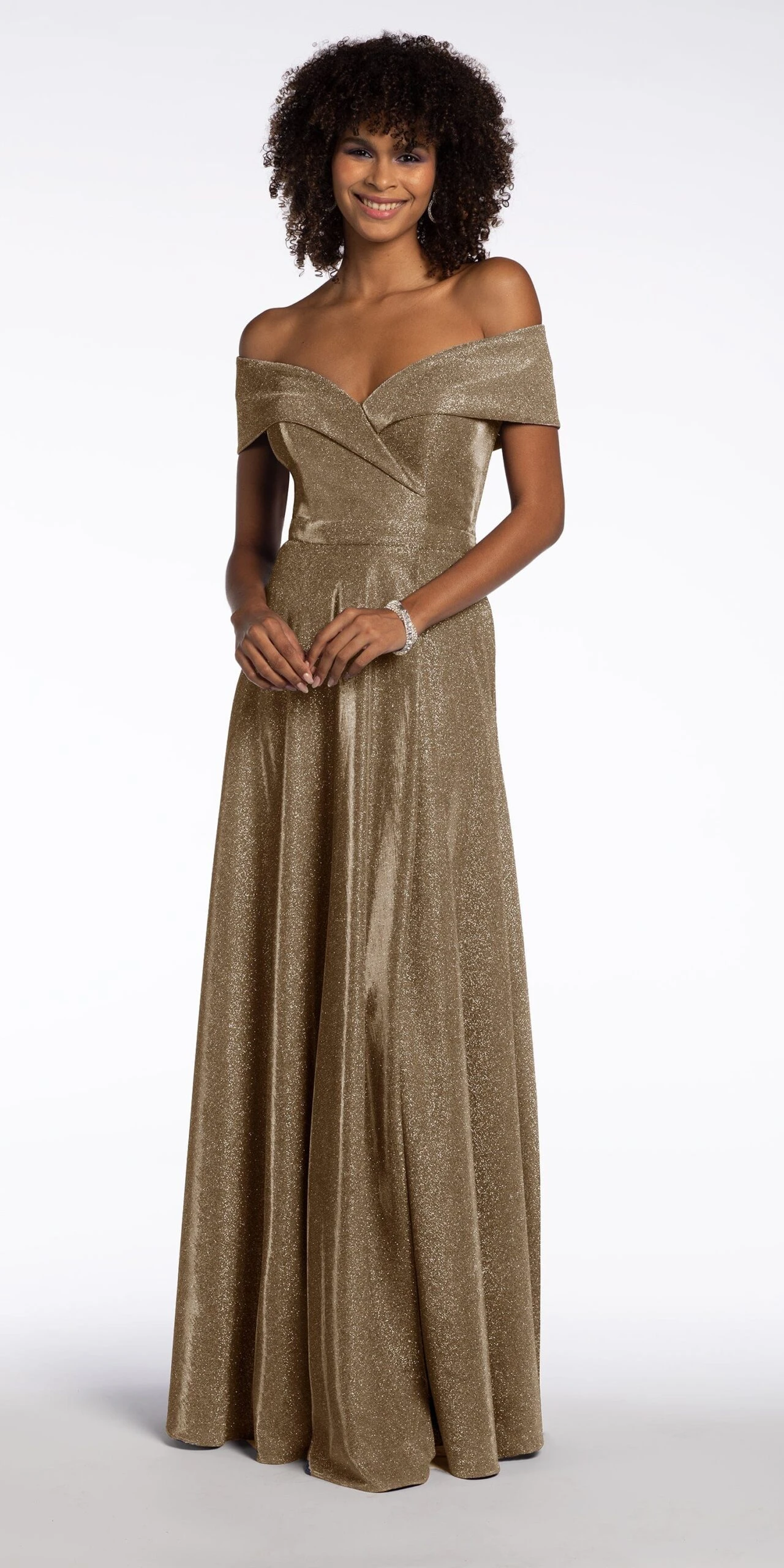 Glow for me! This gold dress will give you that shining presence! This dress features an off the shoulder neckline, mock wrap fitted bodice, a line skirt, and invisible back zipper. This show stopping look is perfect for a wedding, gala, or evening event! Pair this with a sparkly gold clutch to complete the look!