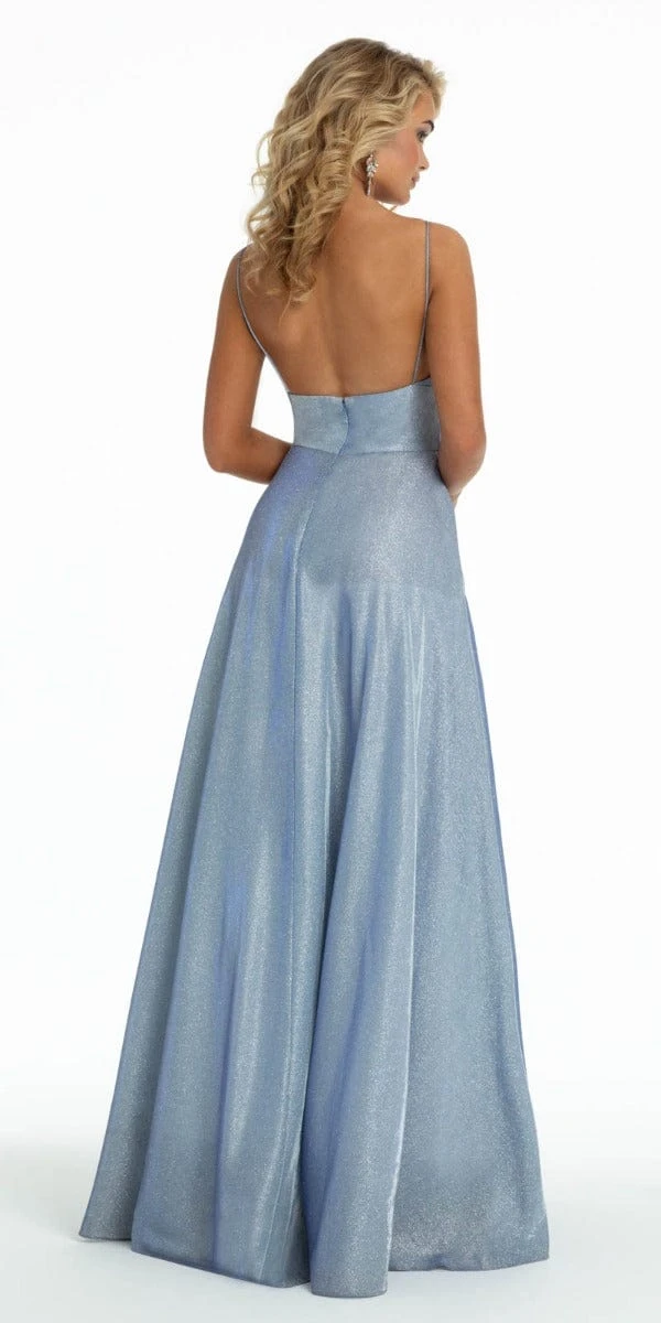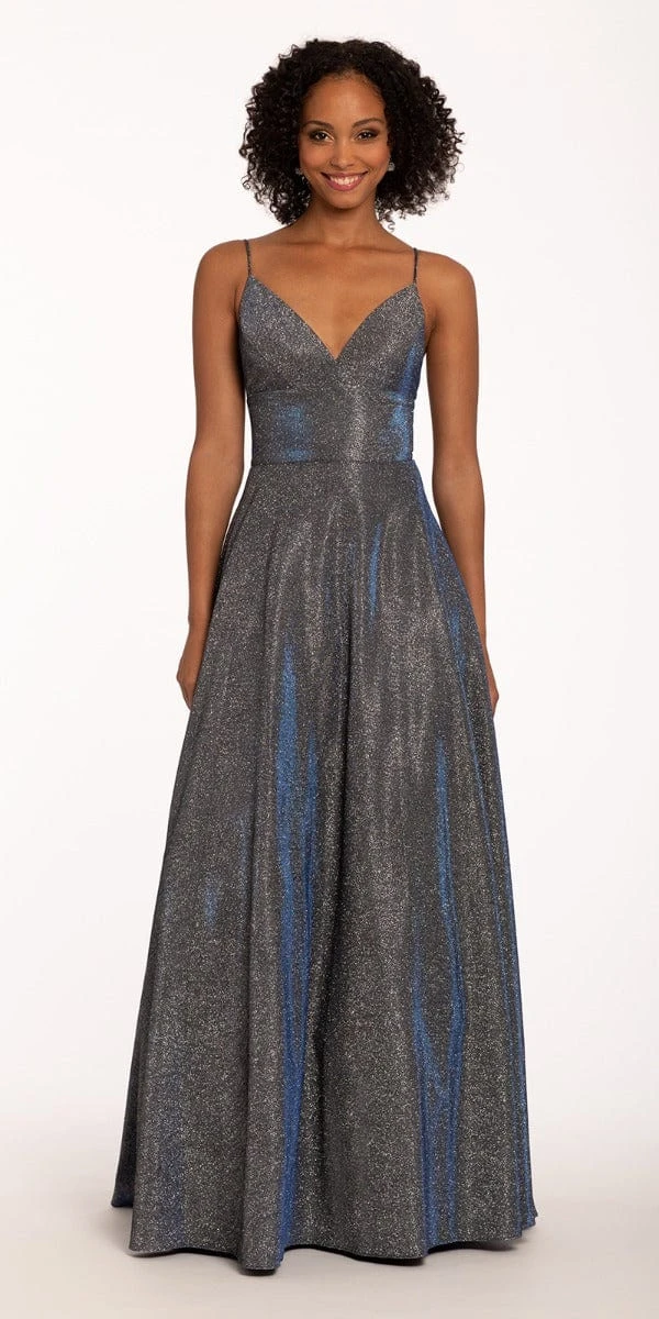 Be the center of attention in this magnificent ball gown dress! Featuring a V-neckline, spaghetti straps, ball gown skirt and eye-catching metallic fabric, this must-have was made for the homecoming queen. Accessorize with a matching metallic clutch and low block heels!