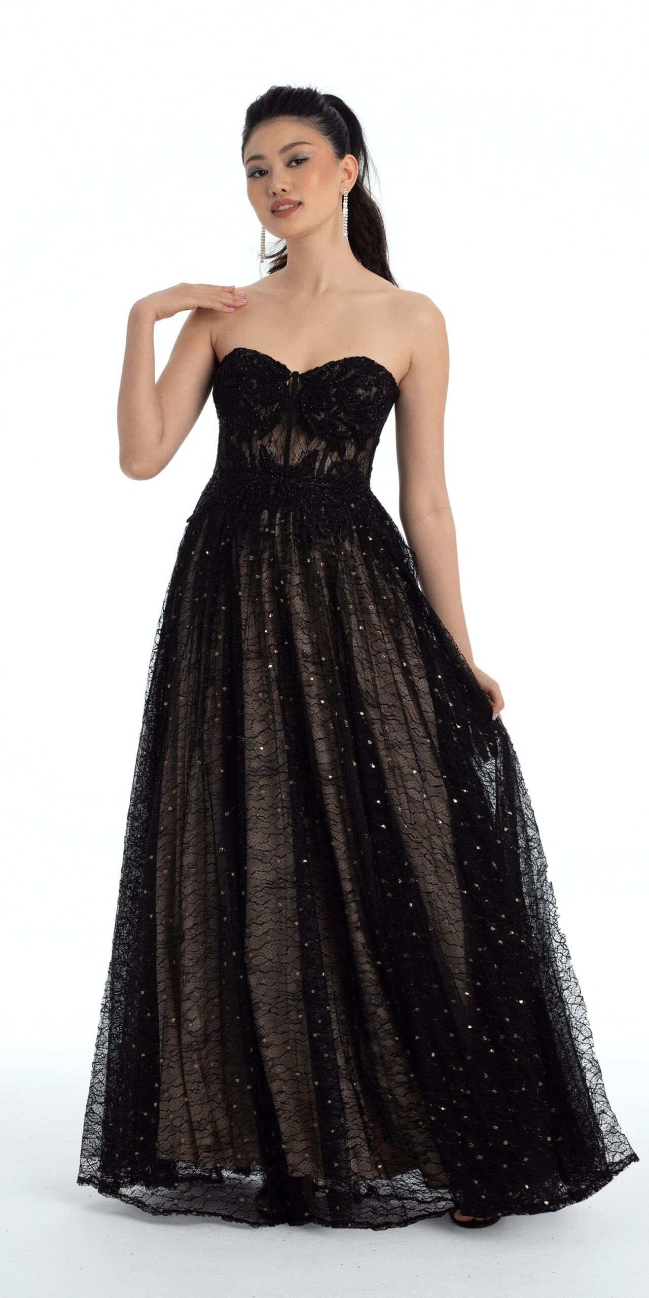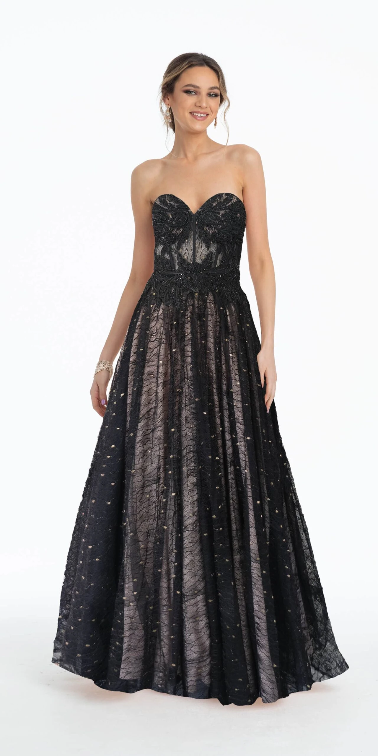 Celebrate the night looking like an absolute two tone dream! This dress features a sweetheart neckline, fitted illusion corset, ball gown silhouette, and lace up back. Your evening awaits, the perfect style for prom, a wedding, or an evening event!