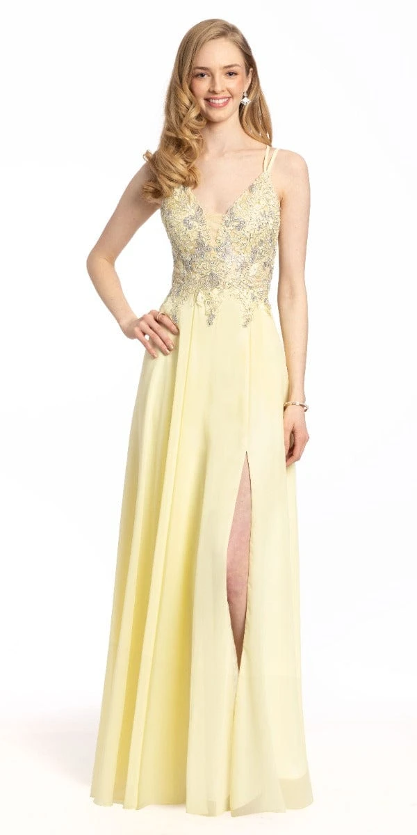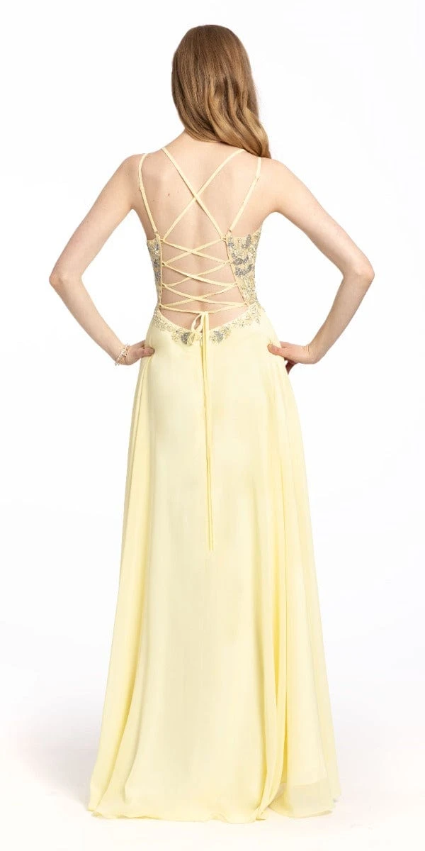 The lady in yellow! This Embroidered Bodice Lace Up Back Chiffon Dress features a v neckline, fitted embroidered bodice, a line skirt, and lace up back. Make your grand entrance at prom, a summer wedding, or evening event. Grab a silver handbag to complete the look!